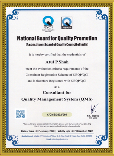 For International Certification Consultancy related work, National Registration Board for Personal and Training (NBQP – A Division of Quality Council of India) has given National vide QMS Consultant Registration (No.-C/QMS/2022/001). Being in the Field of ISO Consultancy become QMS Lead Auditor & FSMS Lead Auditor.